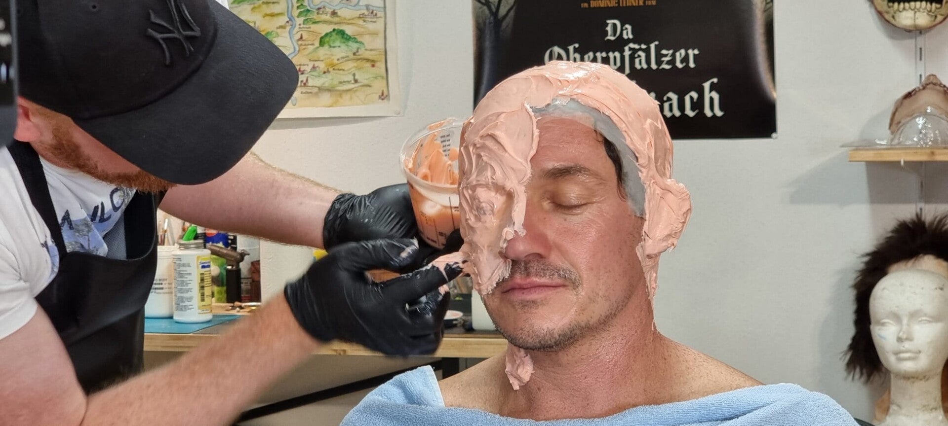 Ein Lifecast mit Silikon ist nichts für schwache Nerven, da man während des Aushärtens lange vollkommen still halten muss. Jede Bewegung kann das Ergebnis verfälschen. Für eine passgenaue und hochdetaillierte Prosthetics-Maske ist dieser Prozess jedoch unumgänglich, da nur so die exakte Anatomie und feinste Details realistisch erfasst werden können.
