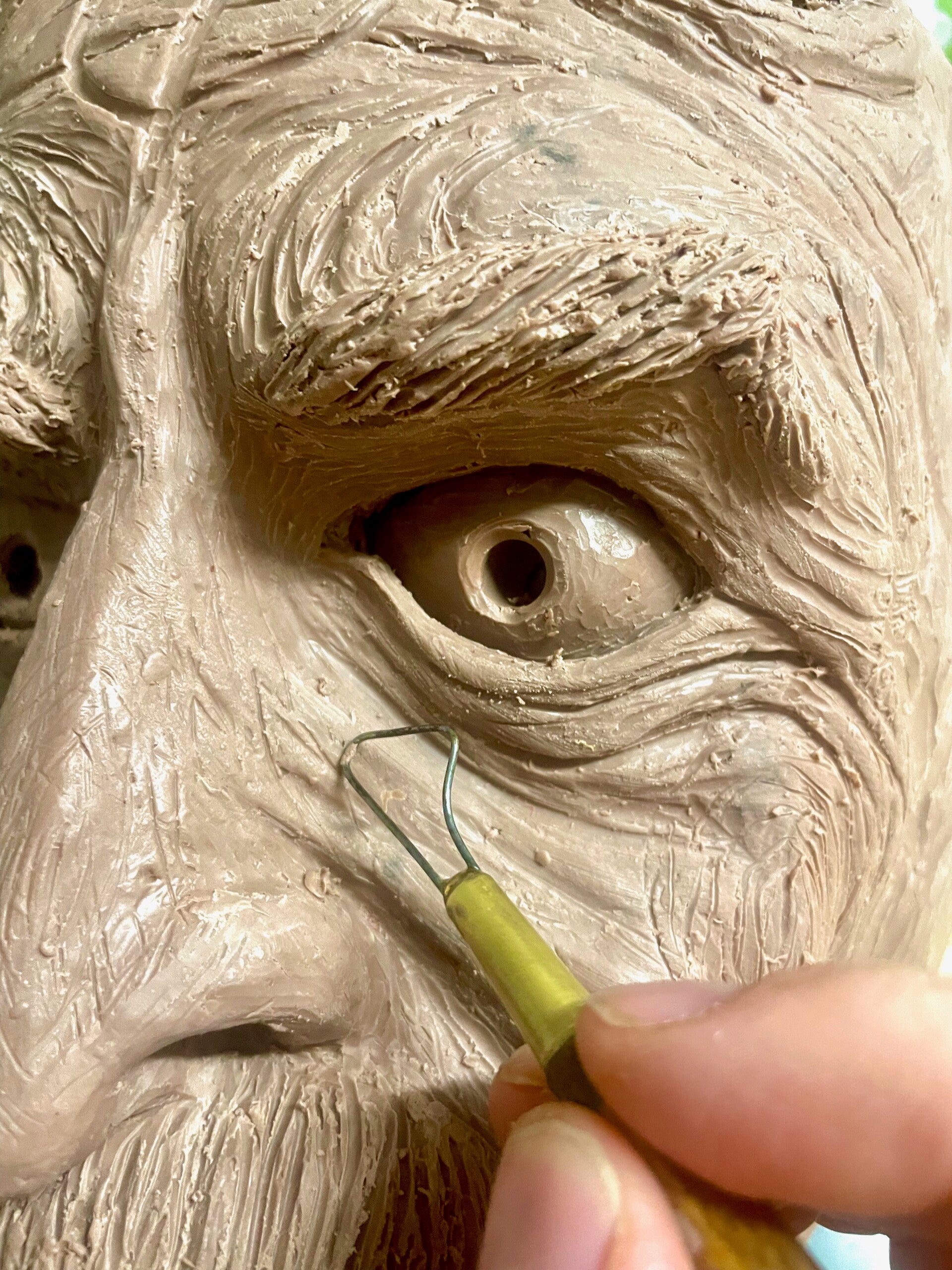 Beim modellieren mit Monster Clay oder WED Clay wird die Form der späteren Maske oder Figur modelliert und verfeinert, entweder frei von Hand oder auf Basis eines Lifecasts. Dabei lassen sich Details, Proportionen und Texturen präzise ausarbeiten, da beide Materialien mehrfach erwärmt, korrigiert und wiederverwendet werden können.